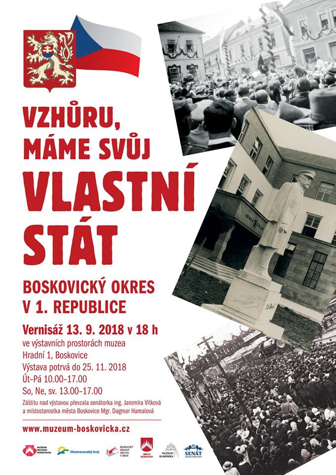 Vzhůru, máme svůj vlastní stát je výstava připravená Muzeem regionu Boskovicka k 100. výročí založení Československa. Senátorka Jaromíra Vítková a místostarostka města Dagmar Hamalová přijaly záštitu nad touto odborně připravenou a na zajímavosti bohatou výstavou. Výstava je ke shlédnutí do 25. listopadu 2018.
