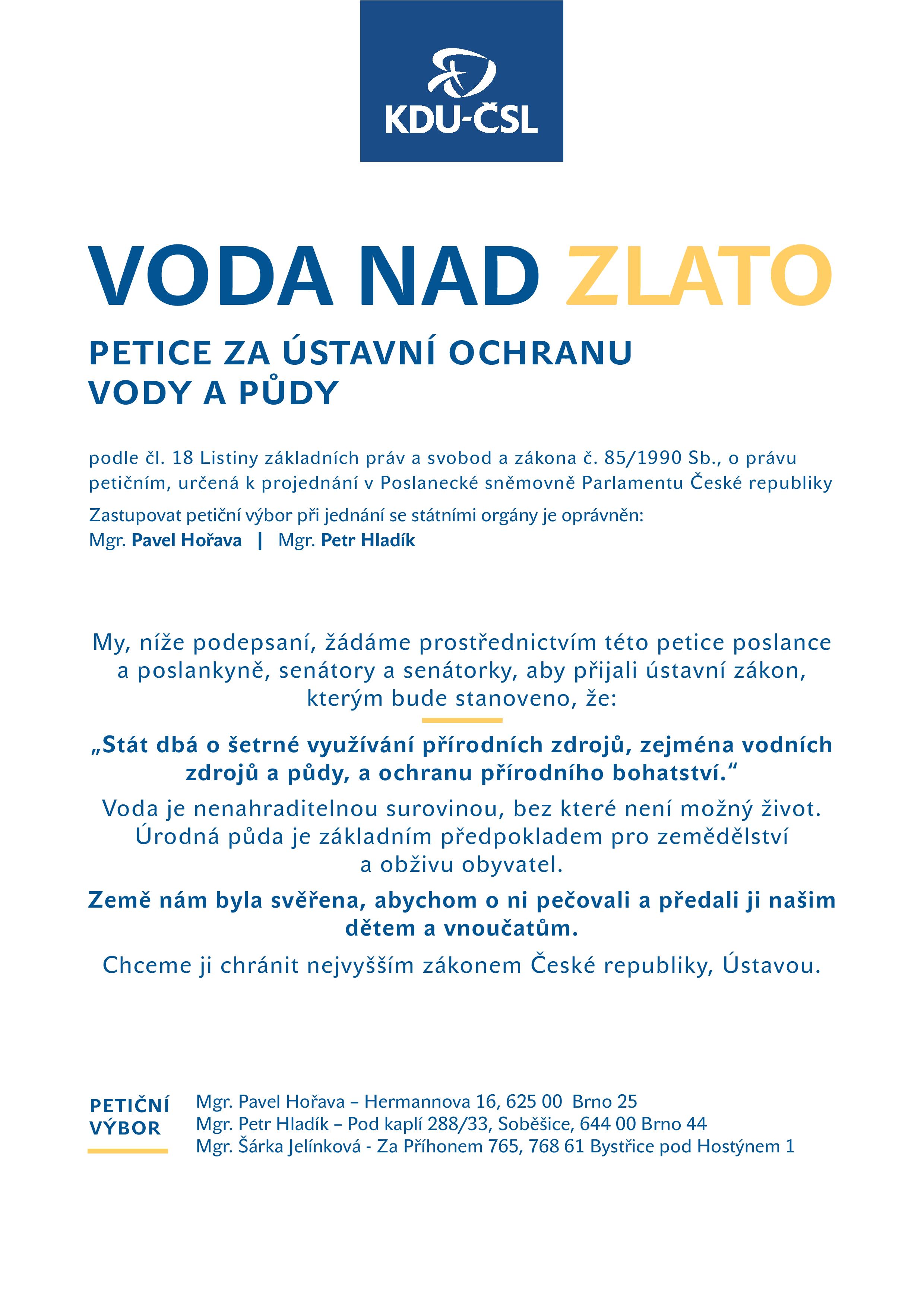 Voda je nenahraditelnou surovinou a součástí našeho každodenního života. Dlouhodobé sucho trápí nejen zemědělce, ale každého z nás. Voda je strategická surovina. Ústavní ochrana vody bude znamenat nadřazení obecného zájmu o její ochranu. Ve skutečnosti se to může promítnout při ochraně podzemních vod před kontaminací nebo při budování opatření zadržujících vodu v krajině. Česká republika se tak hrdě přihlásí k boji proti suchu a dá jasně najevo, že bez vody se nedá žít.