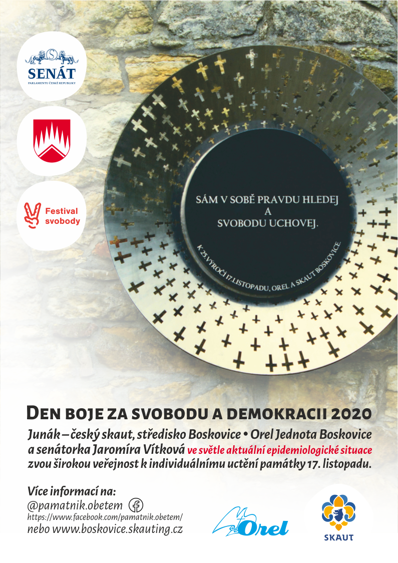 Veškeré informace k „Připomínce 17. listopadu“ 2020 budou zveřejněny na facebooku Památník obětem totalitních režimů Boskovice, Orel jednota Boskovice, Jaromíra Vítková senátorka a Junák - český skaut, středisko Boskovice.