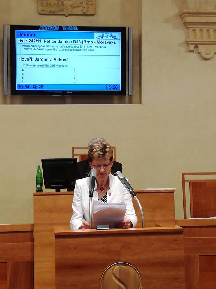 Petice na podporu přípravy a realizace dálnice D43 (Brno – Moravská Třebová) a Zásad územního rozvoje Jihomoravského kraje (dále jen Petice) byla předána do Senátu 15. 2. 2018 paní senátorkou Ing. Jaromírou Vítkovou za petiční výbor předsedovi senátu Milanovi Štěchovi. Následně garanční Výbor pro vzdělávání, vědu, kulturu, lidská práva a petice (VVVK) uskutečnil k Petici veřejné slyšení v Senátu v úterý 13. března. Garanční výbor shledává Petici za D 43 důvodnou a následná navržená usnesení se týkají zejména požadavku na dokončení vypracování Studie proveditelnosti stavby D 43 v úseku od Moravské Třebové po Bořitov, dále přípravu a projednání všech potřebných dokumentací a náležitostí k vydání územního rozhodnutí. Žádá zařadit tuto stavbu mezi prioritní dopravní stavby ČR. Dále Výbor naznal, že je třeba zajistit včasnou aktualizaci Politiky územního rozvoje v souladu se ZÚR JMK a řešit vlastnictví pozemků nutných k výstavbě. „Podpisové archy stále dochází do mé kanceláře a nyní máme celkově 18 324 podpisů,“ uvedla Vítková.
